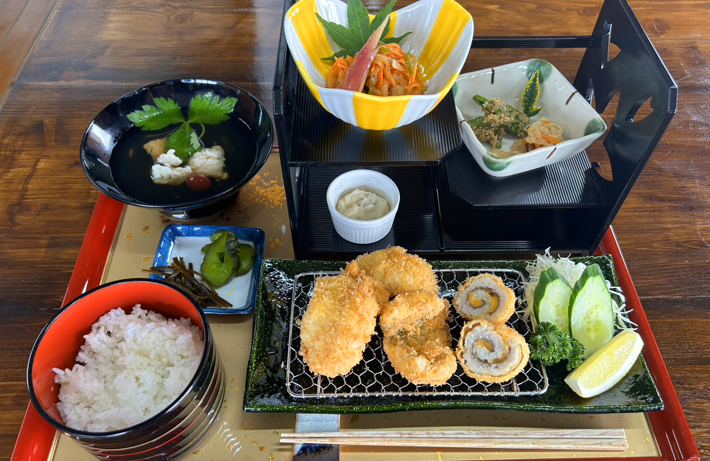 ◯カキフライ、牡蠣ご飯、牡蠣と鱧のお吸い物